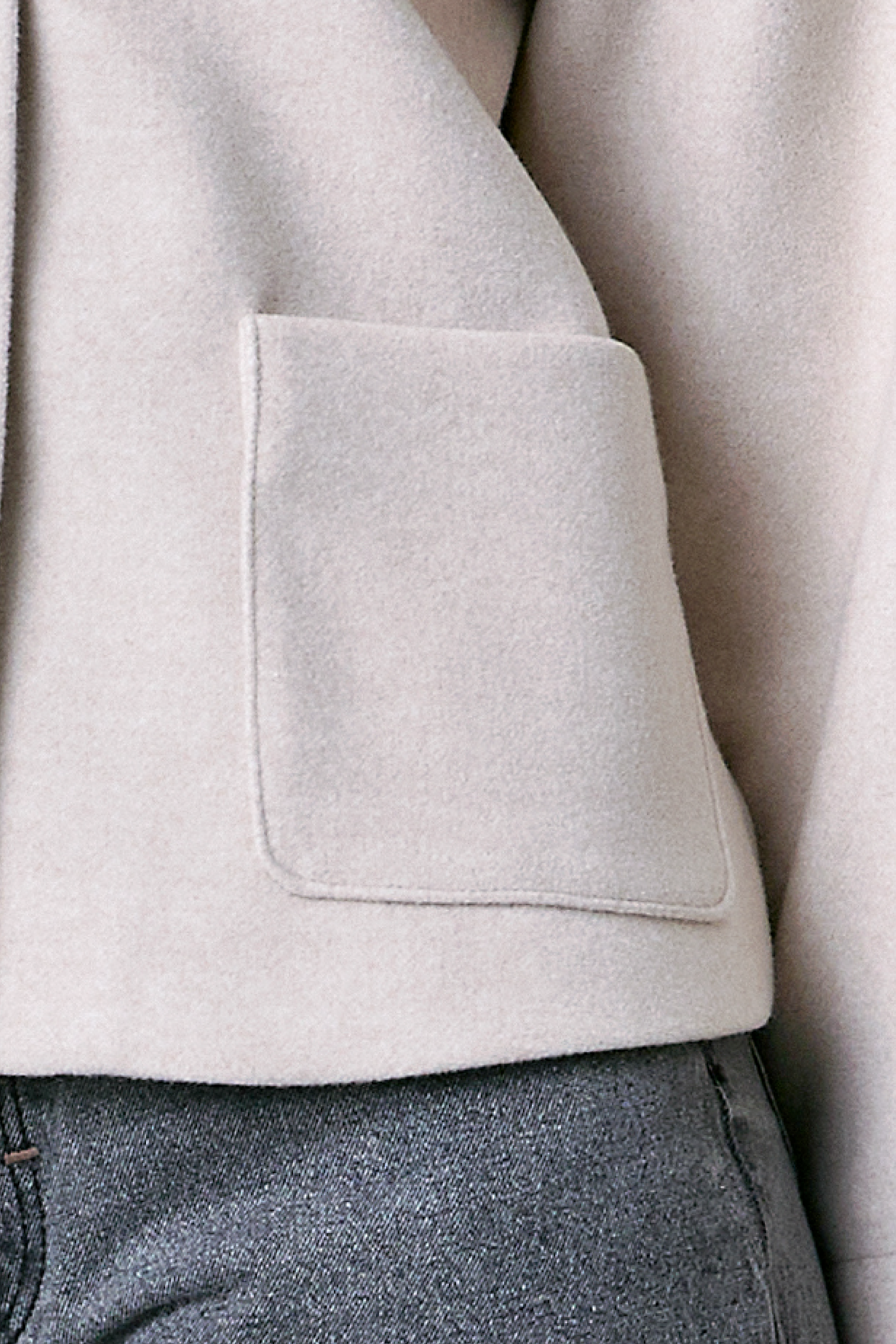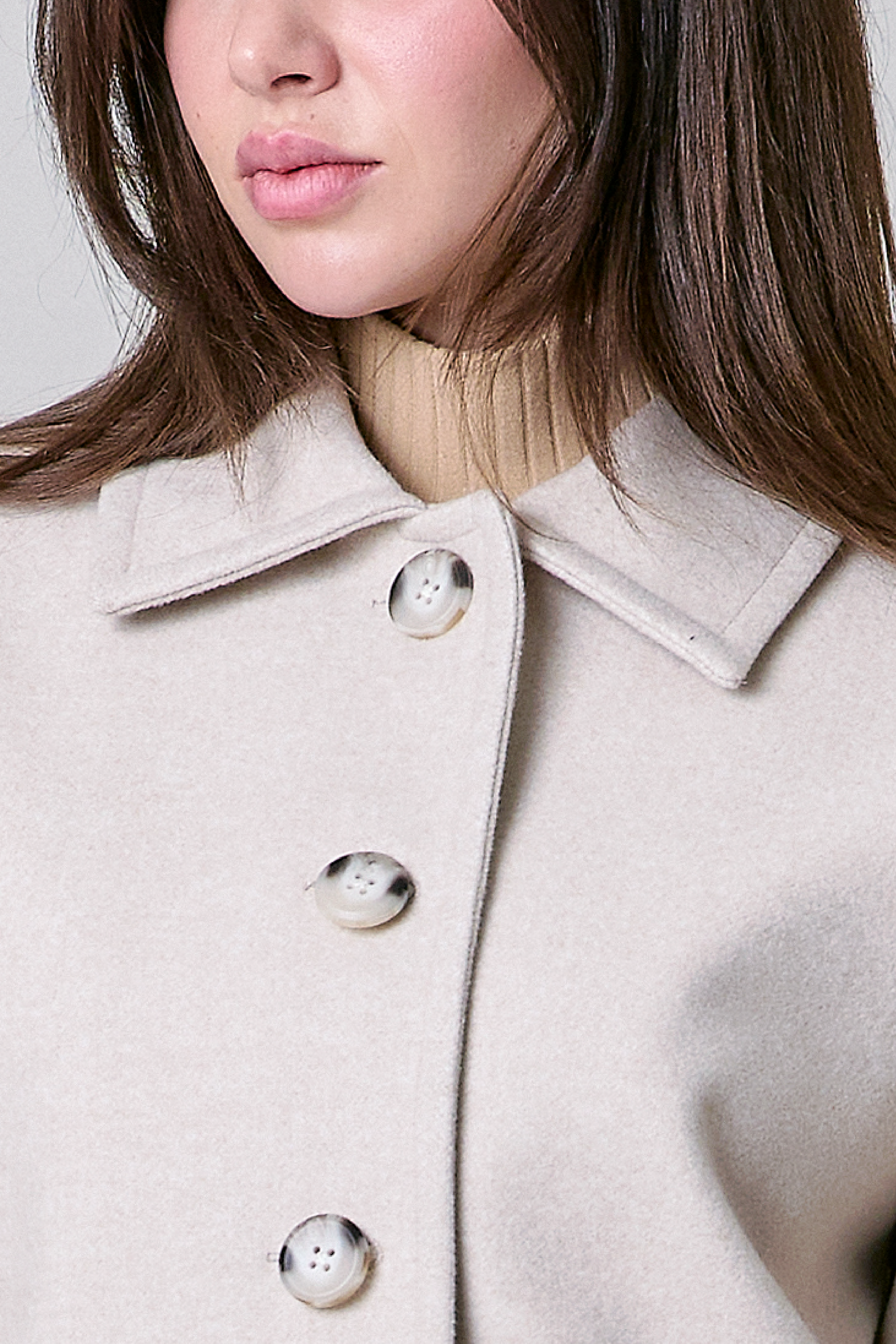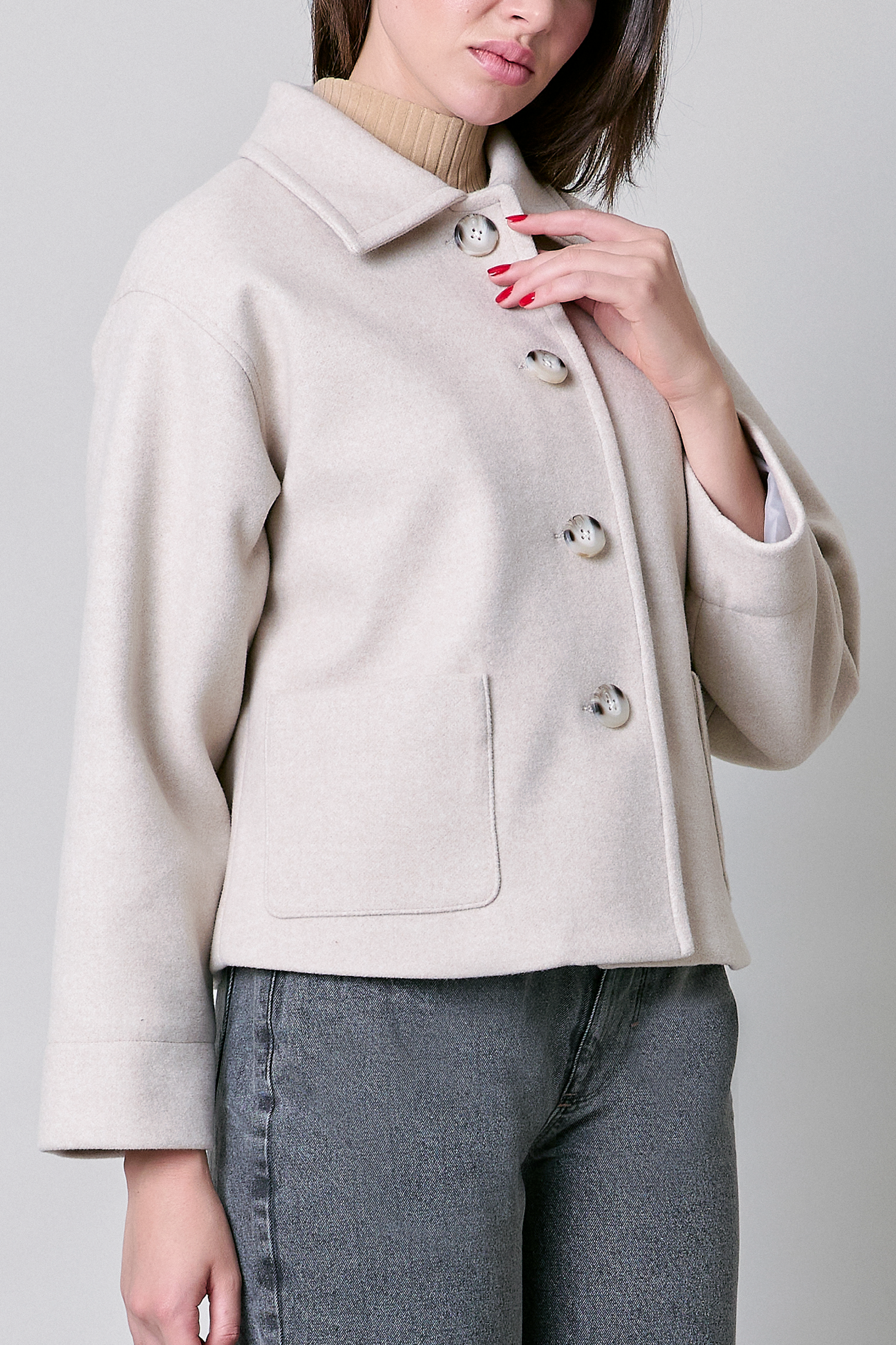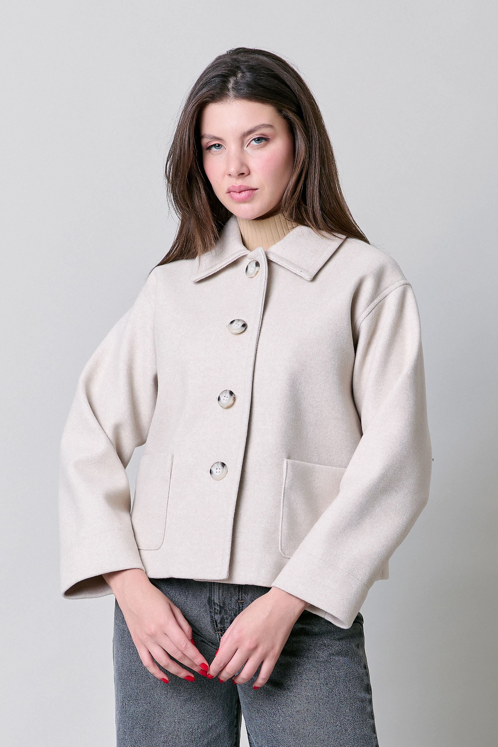 Abrigo color blanco con bolsillos y cuello camisero.
