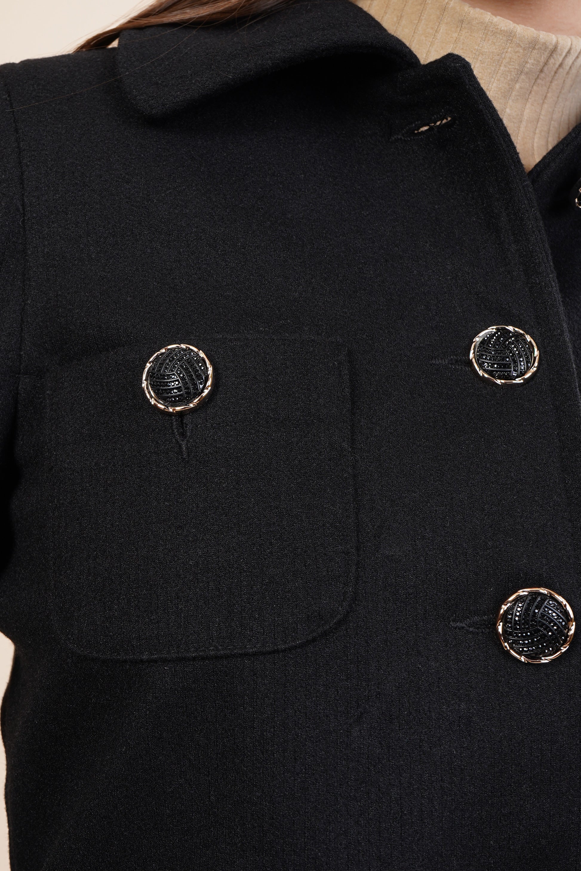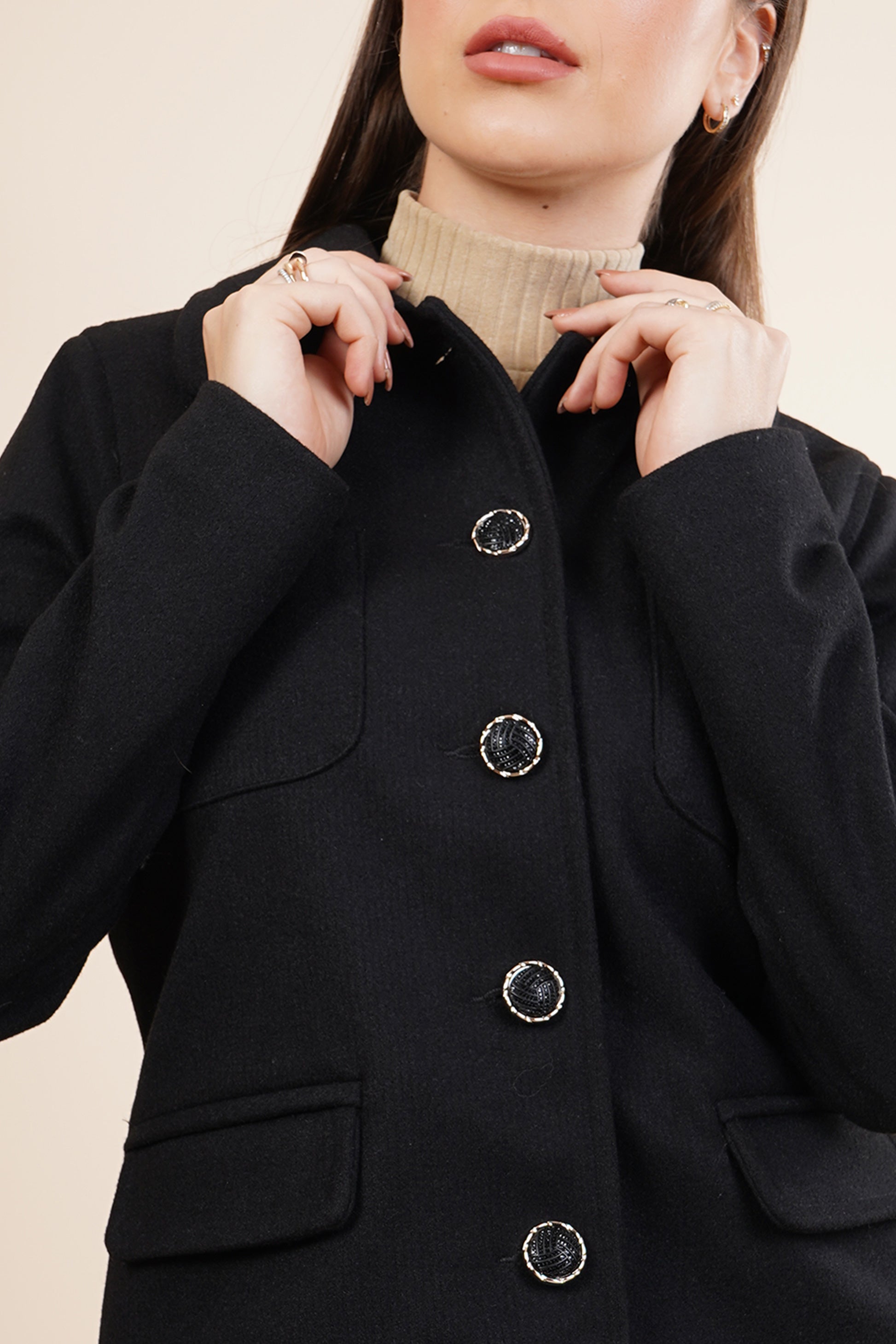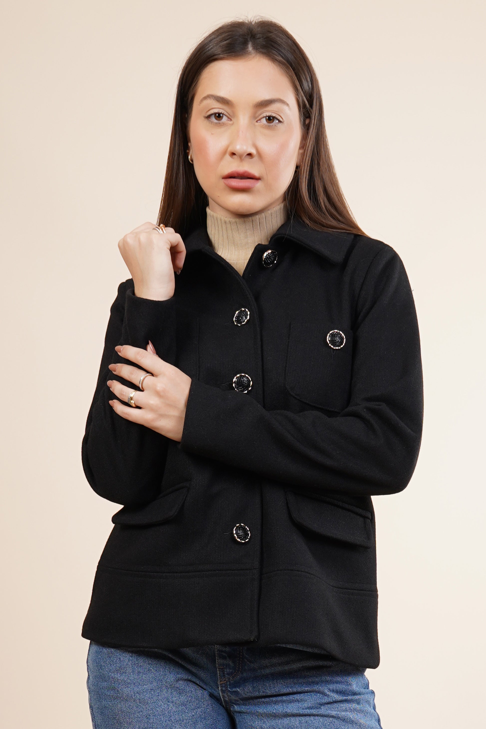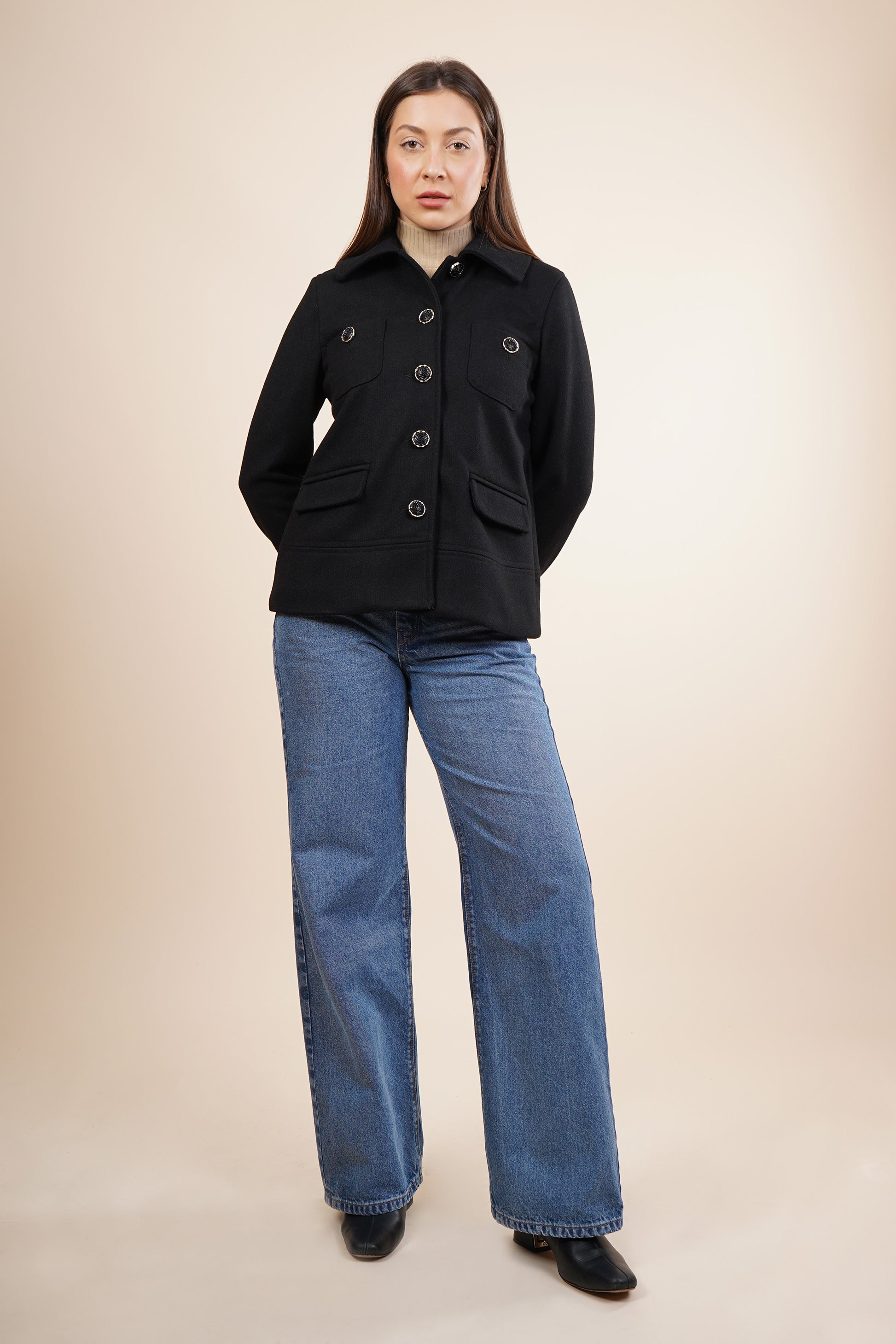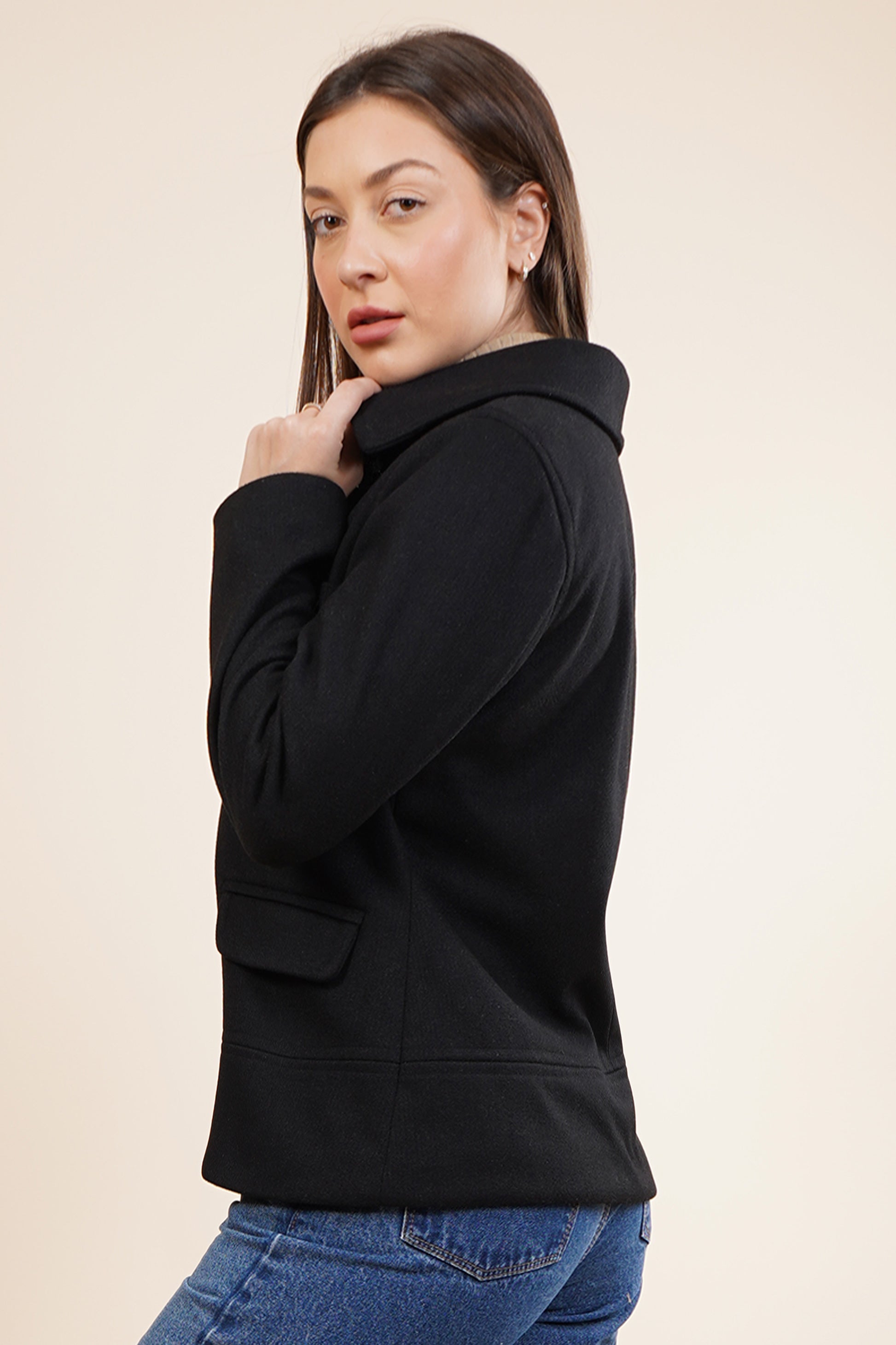 Abrigo color negro, corto con bolsillos.