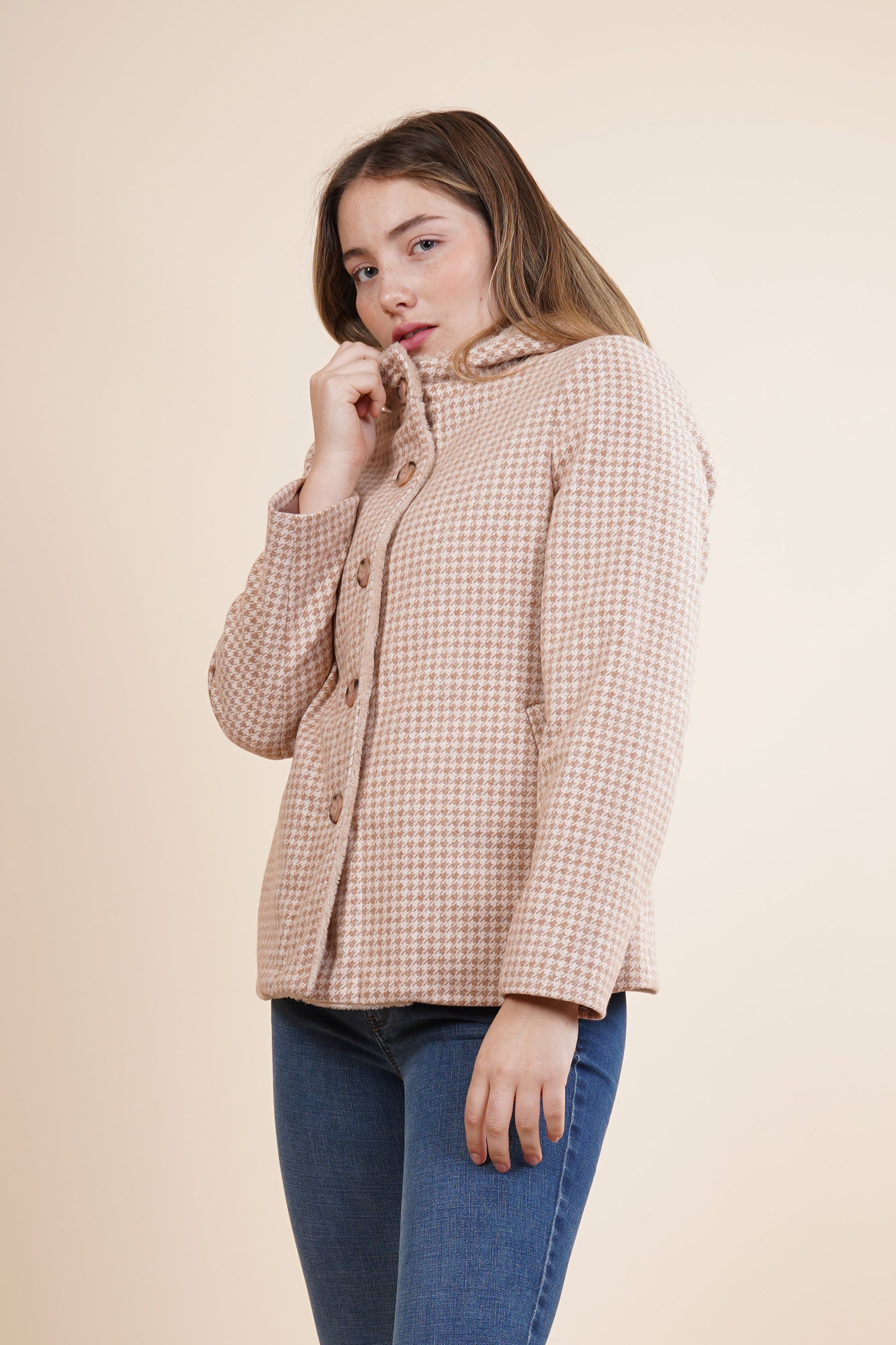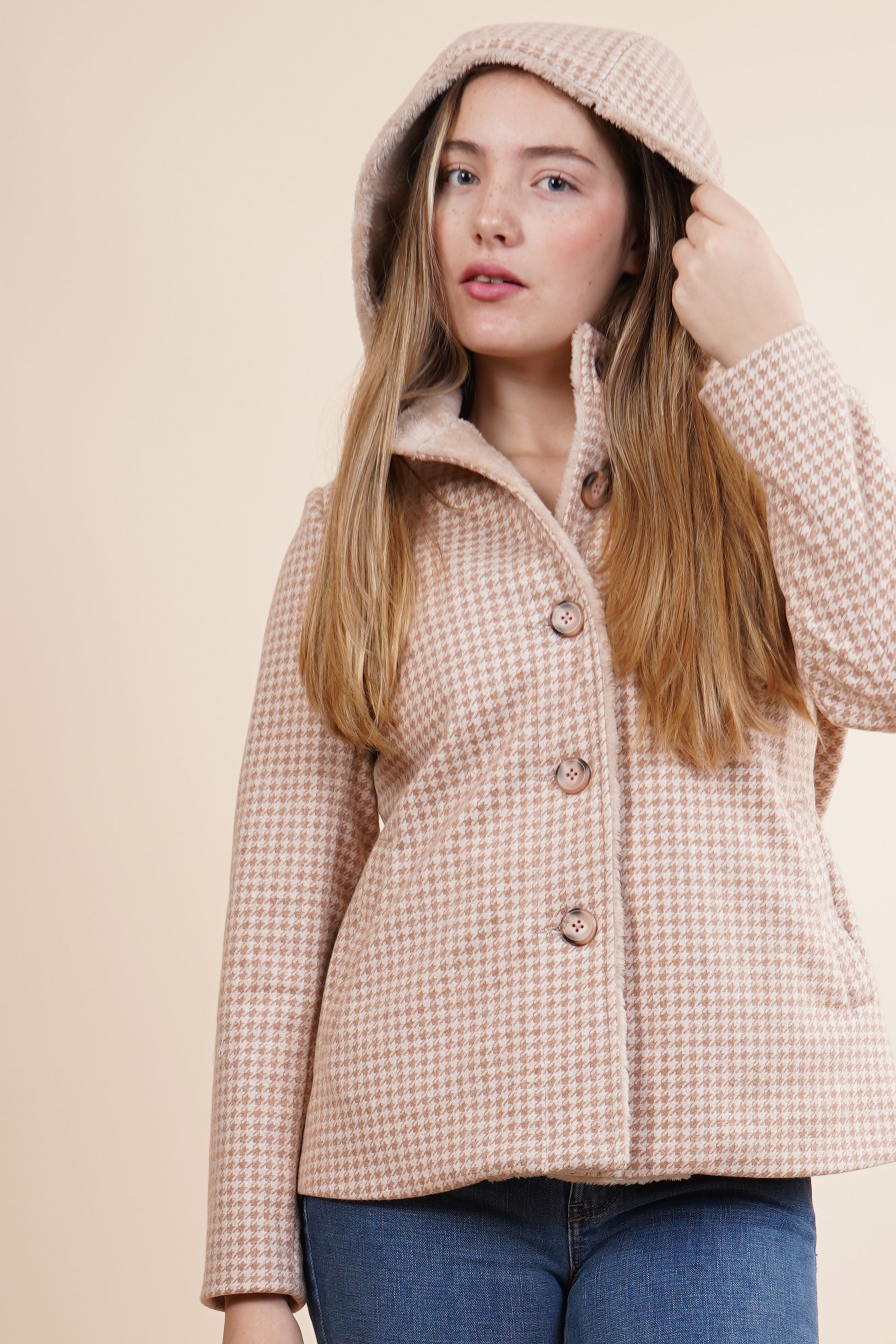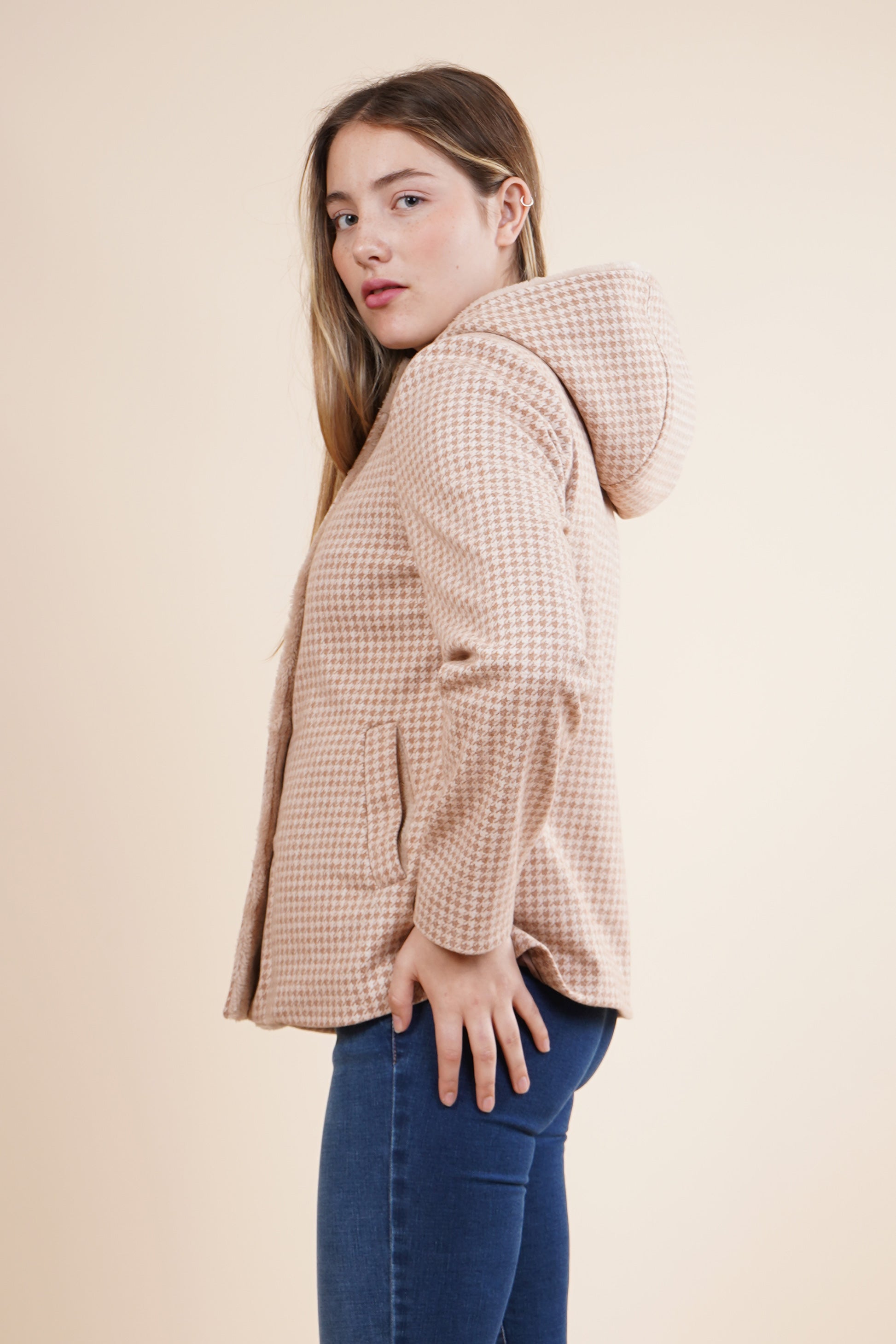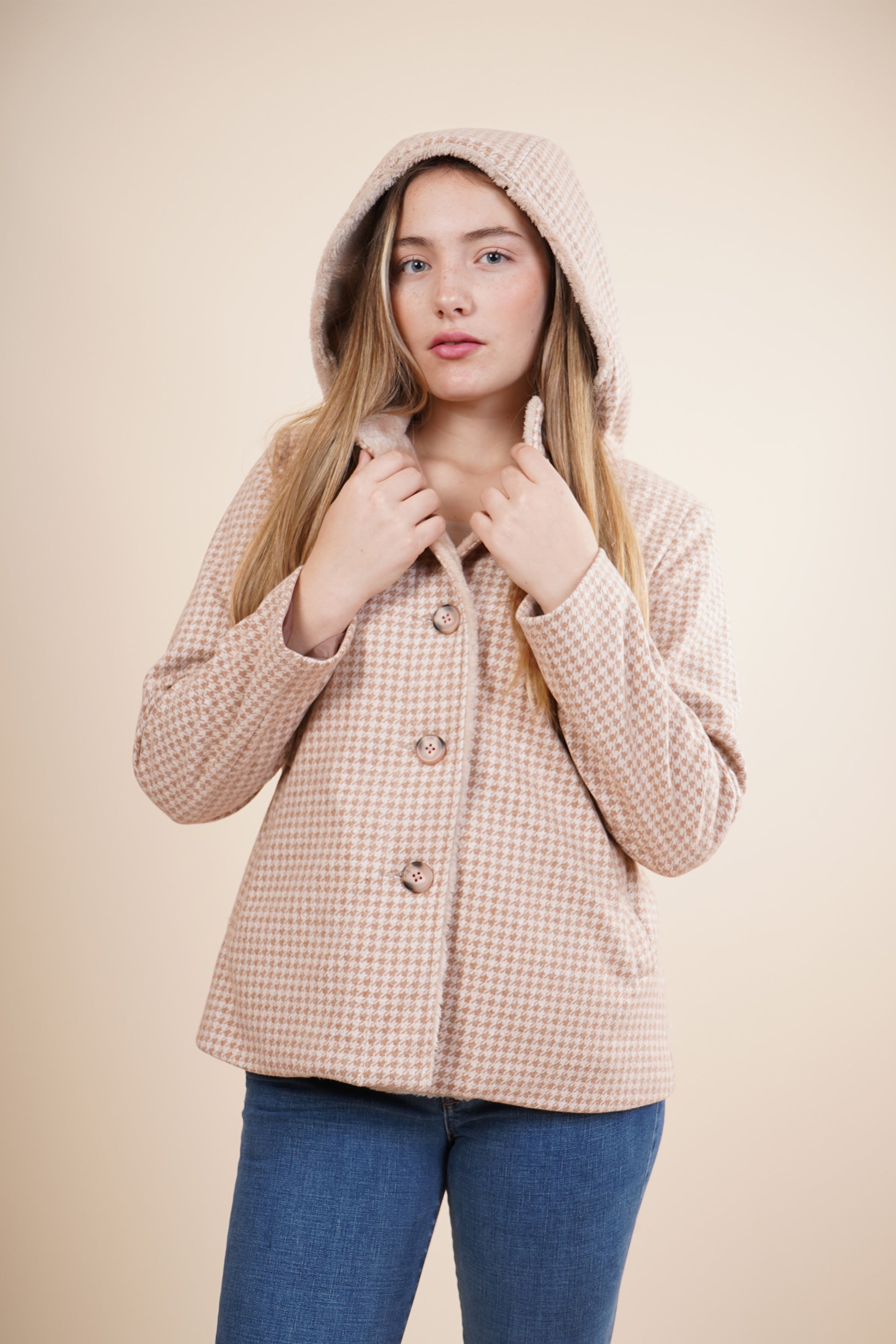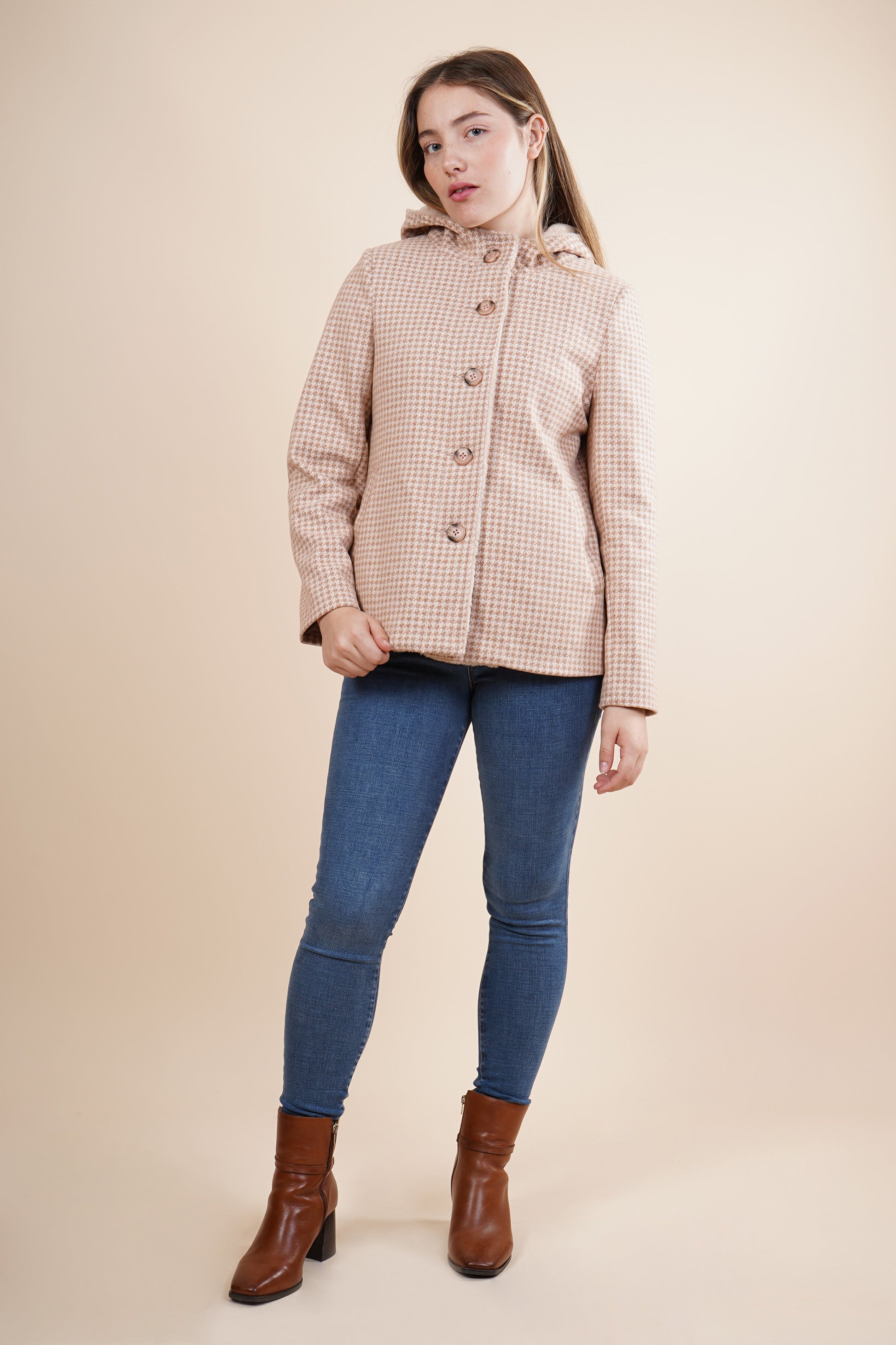Abrigo color beige,  corto con capucha, estampado a cuadros.