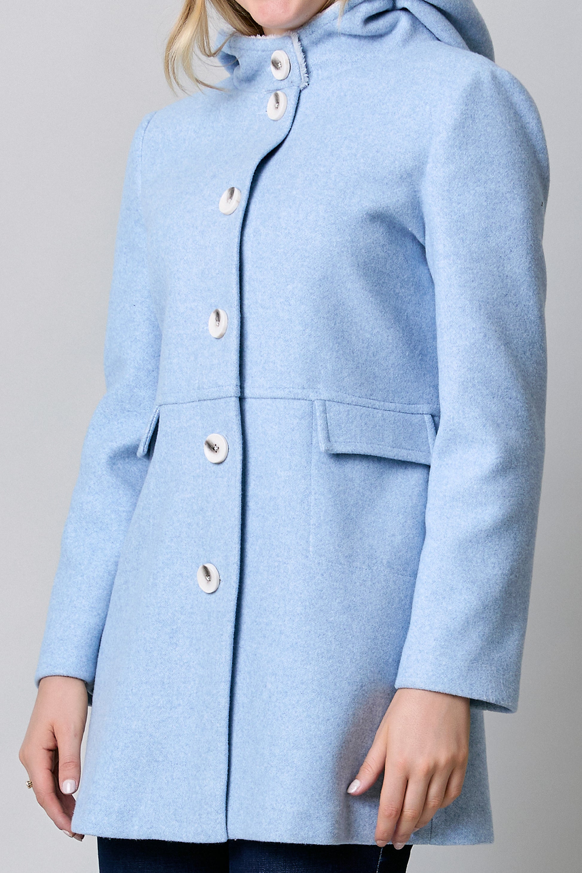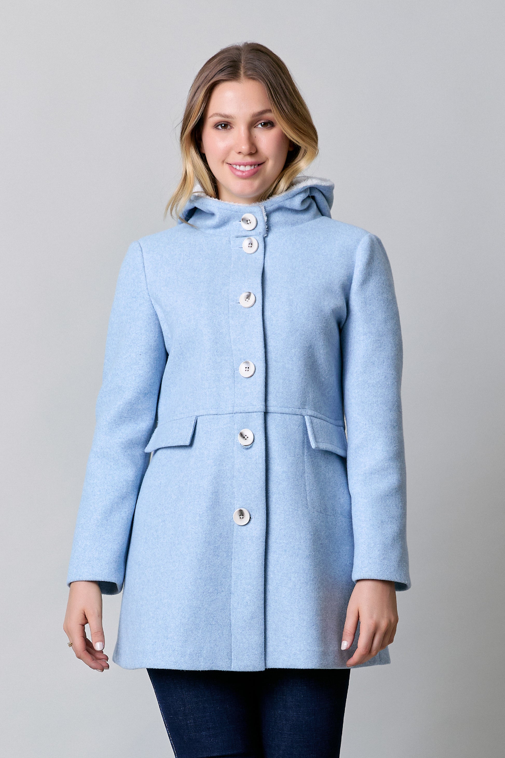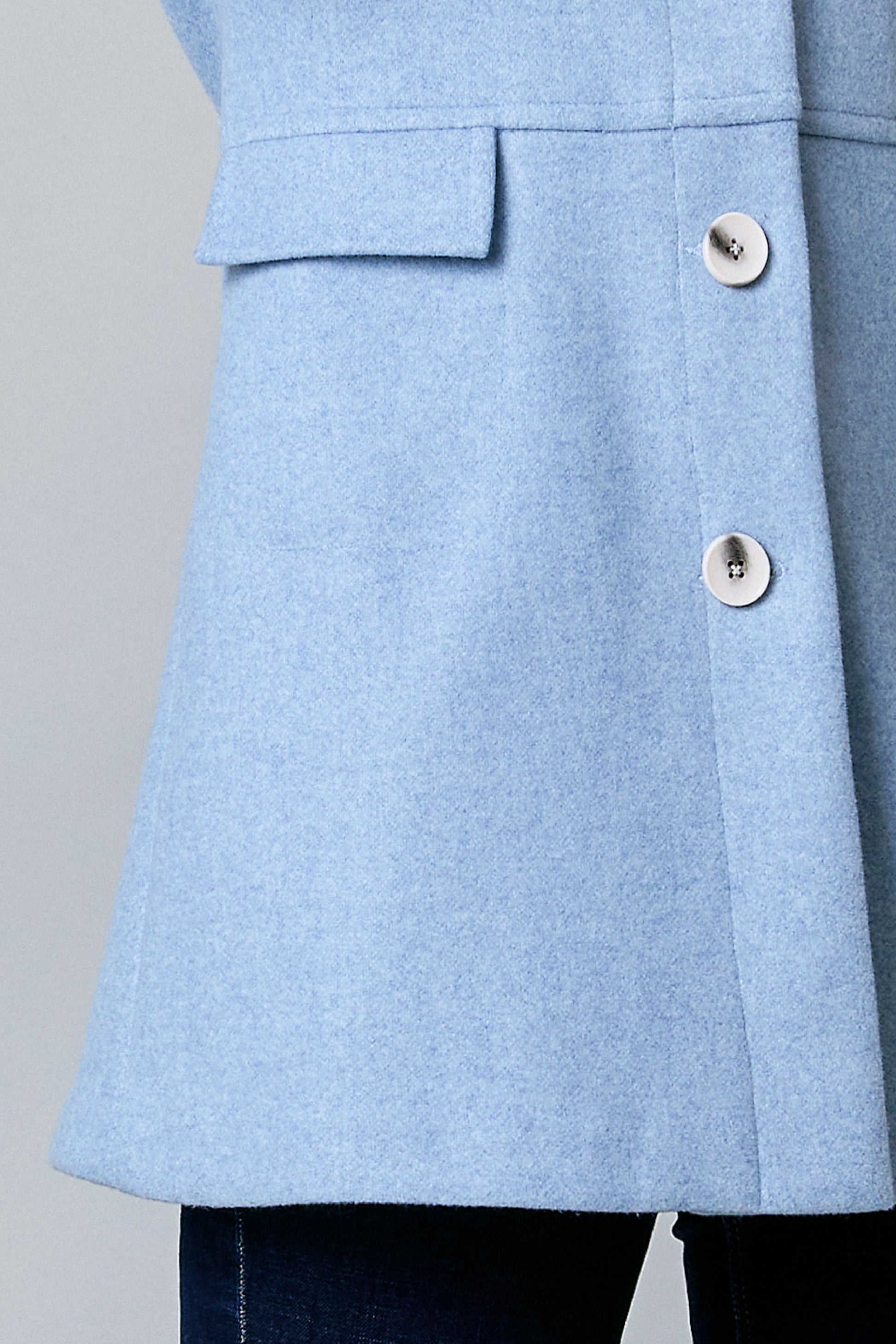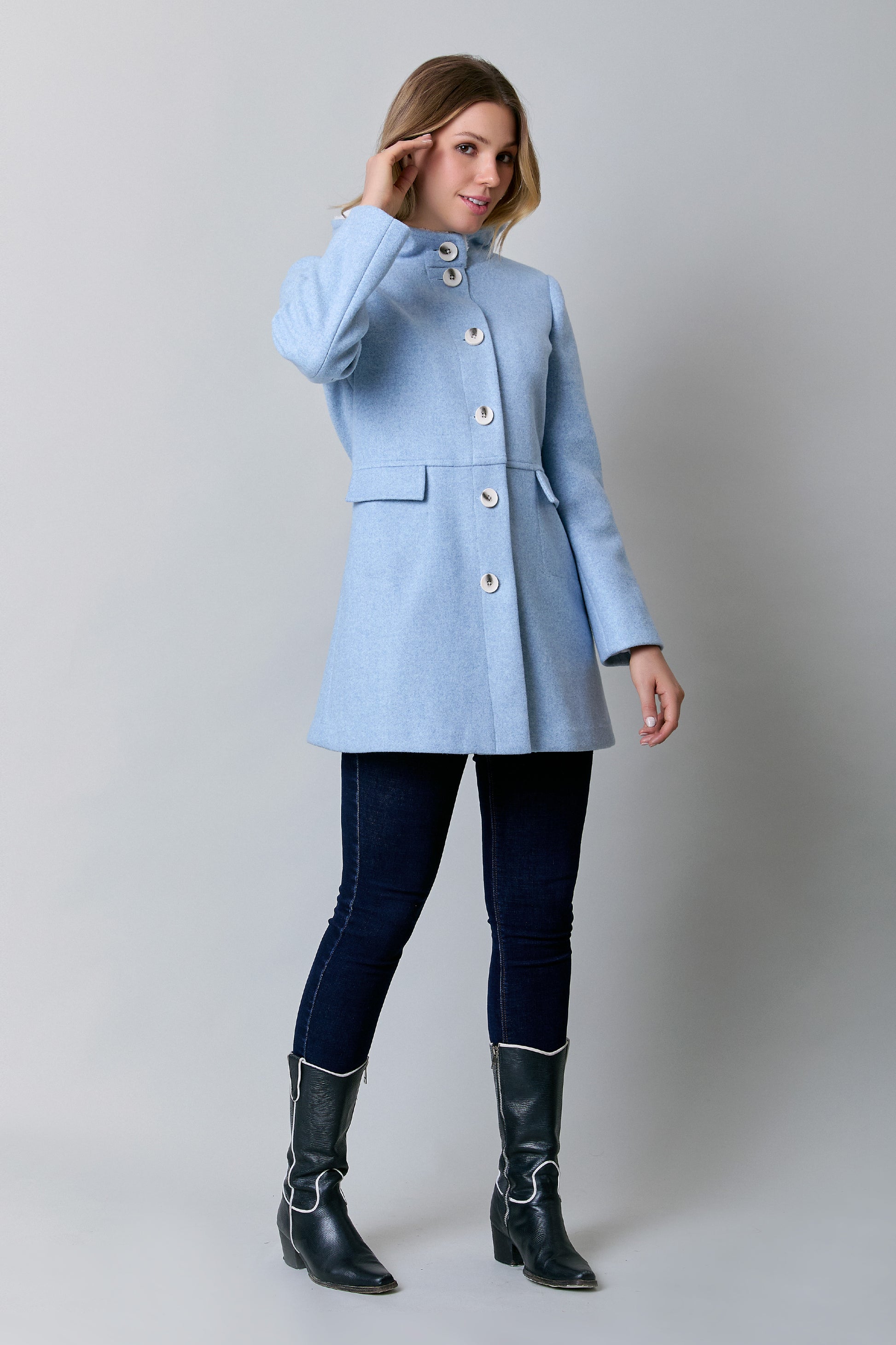 Abrigo color azul largo, detalles de bolsillo con gorra.