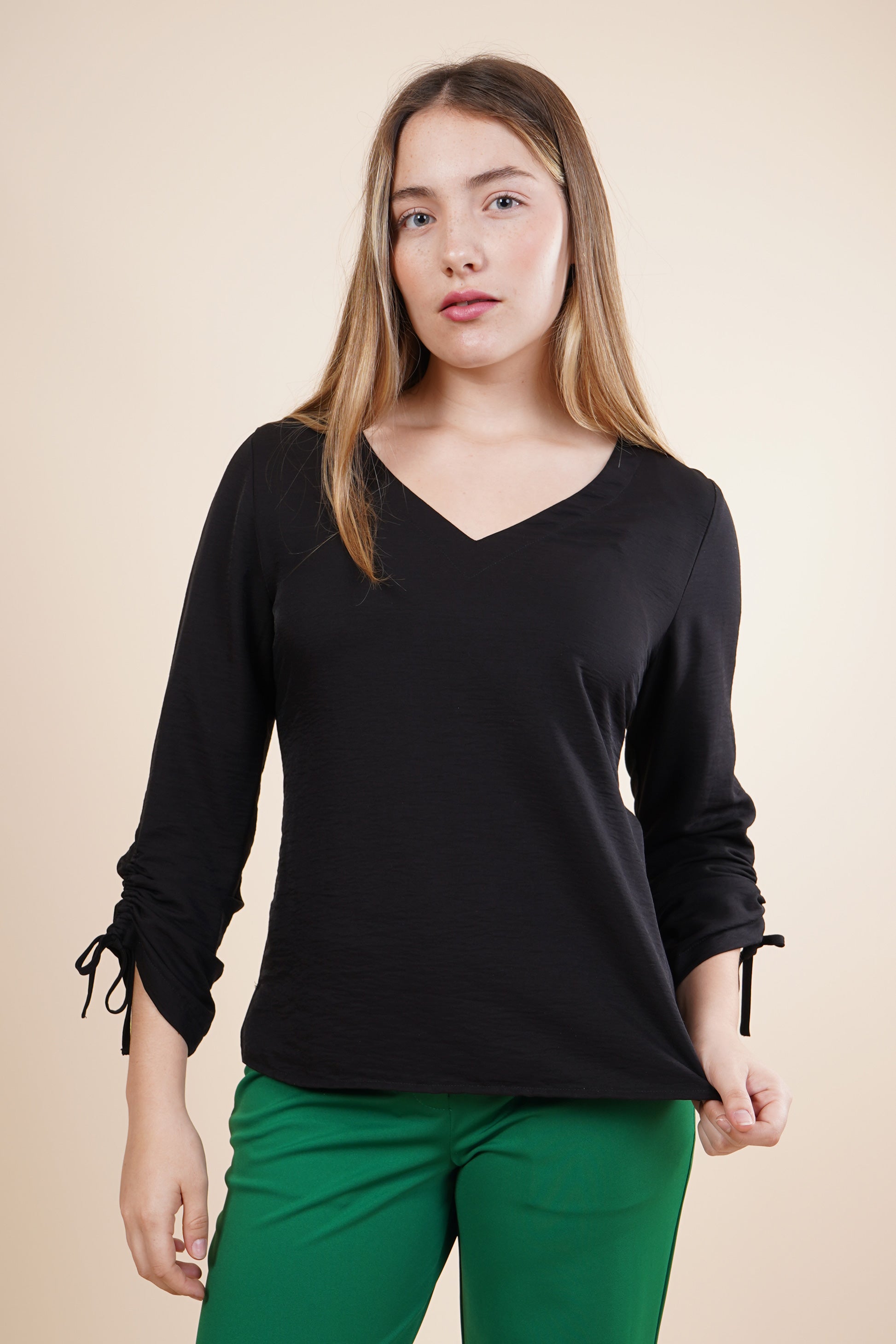 Blusa de corte recto en tela tejida con cuello en V. Mangas 3/4 con cinta ajustable.