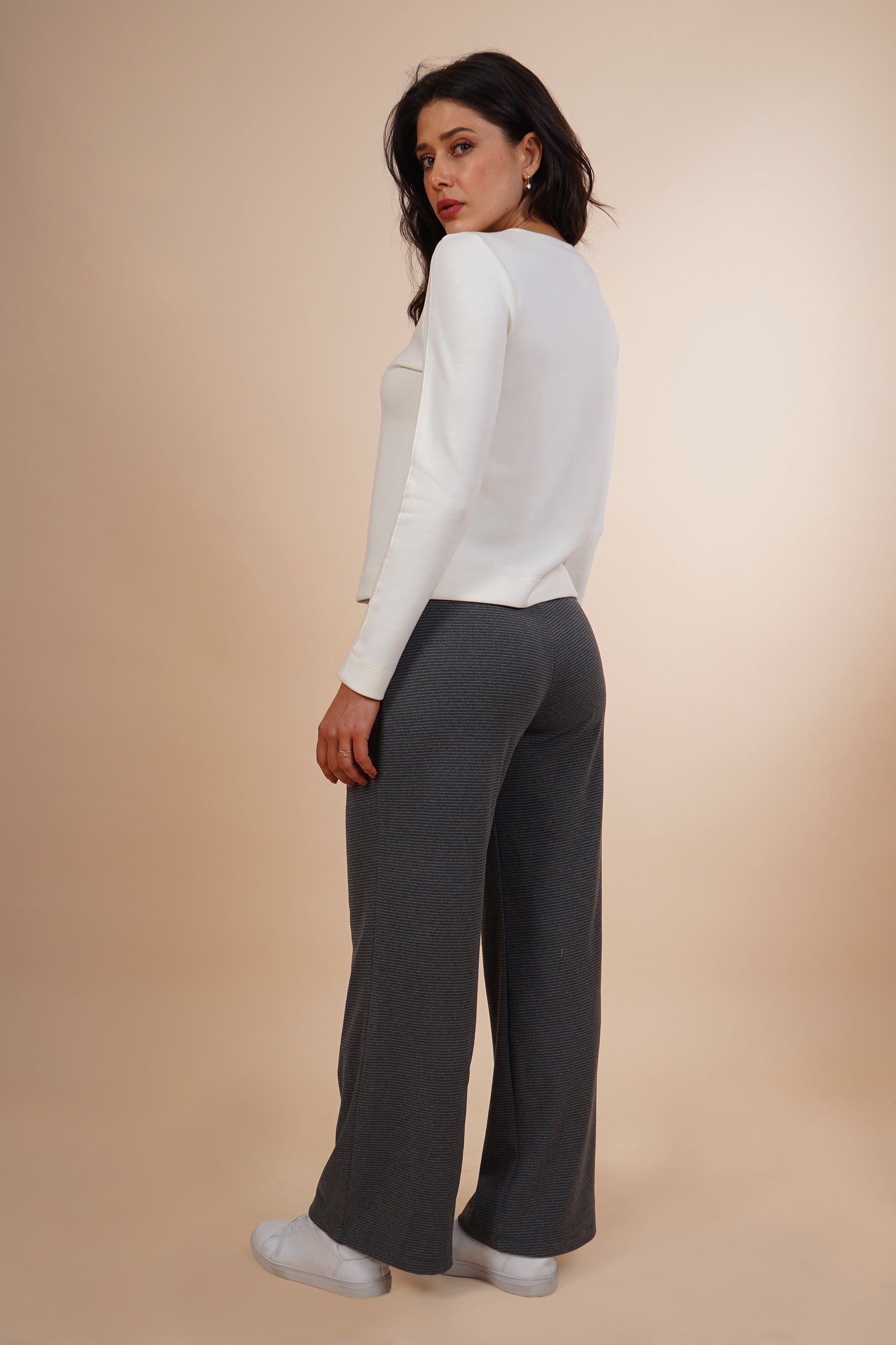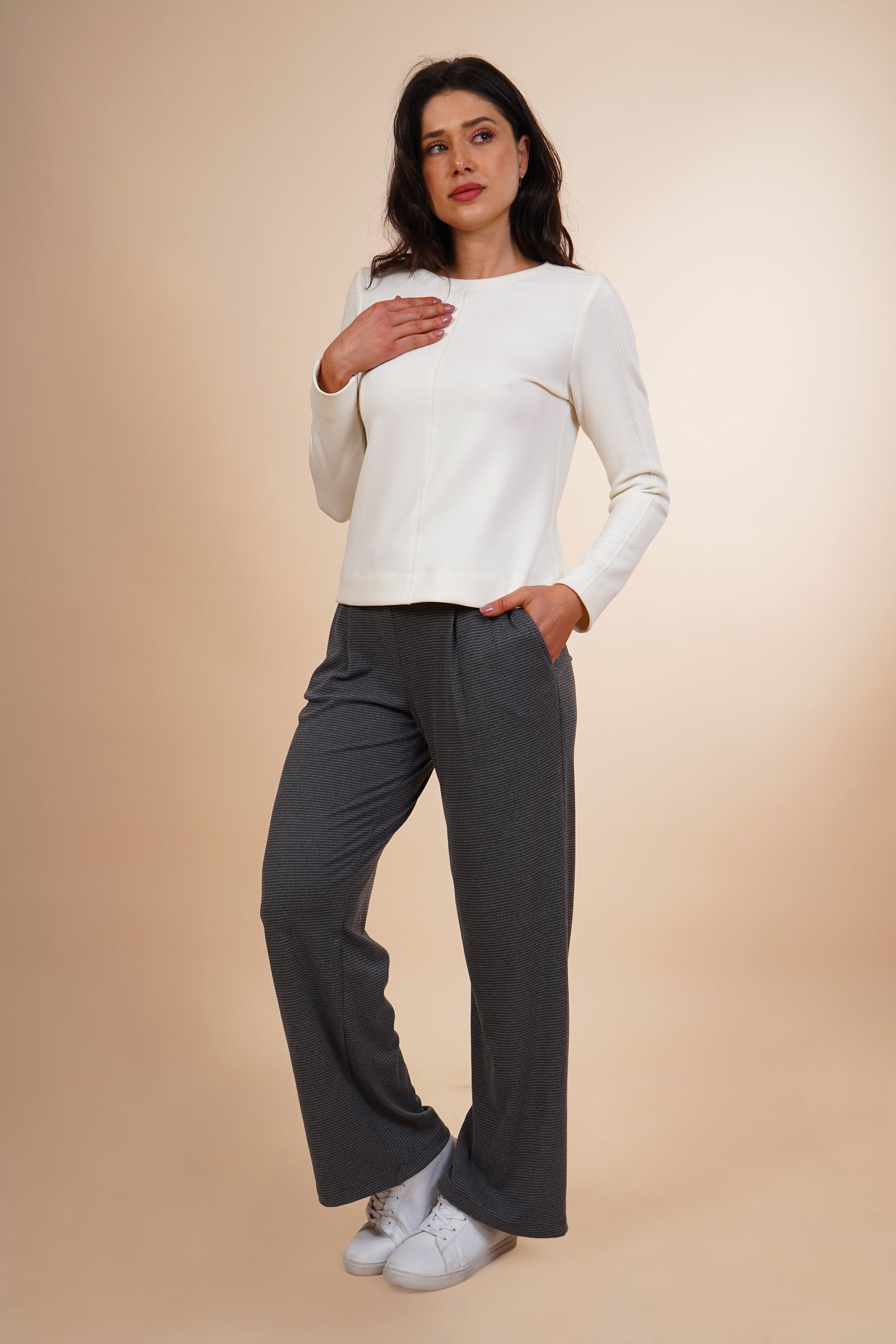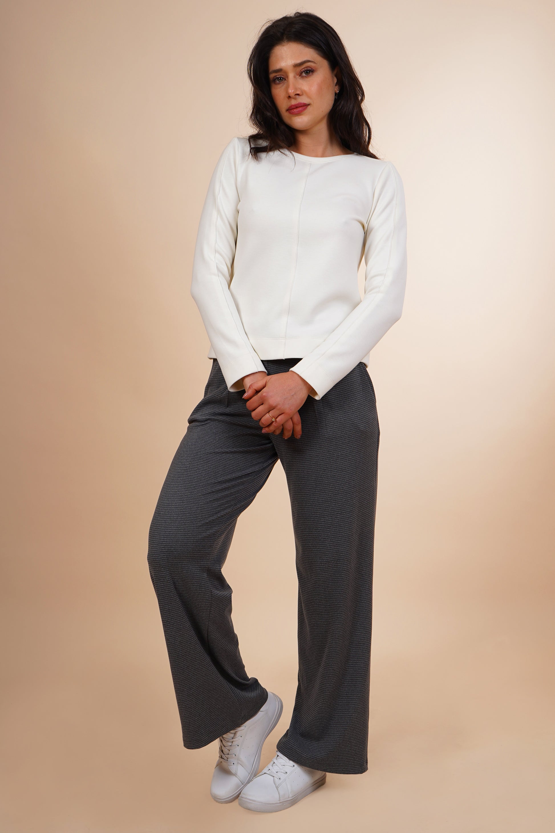 Blusa de manga larga tipo suéter con cuello redondo. Corte recto con línea en medio.