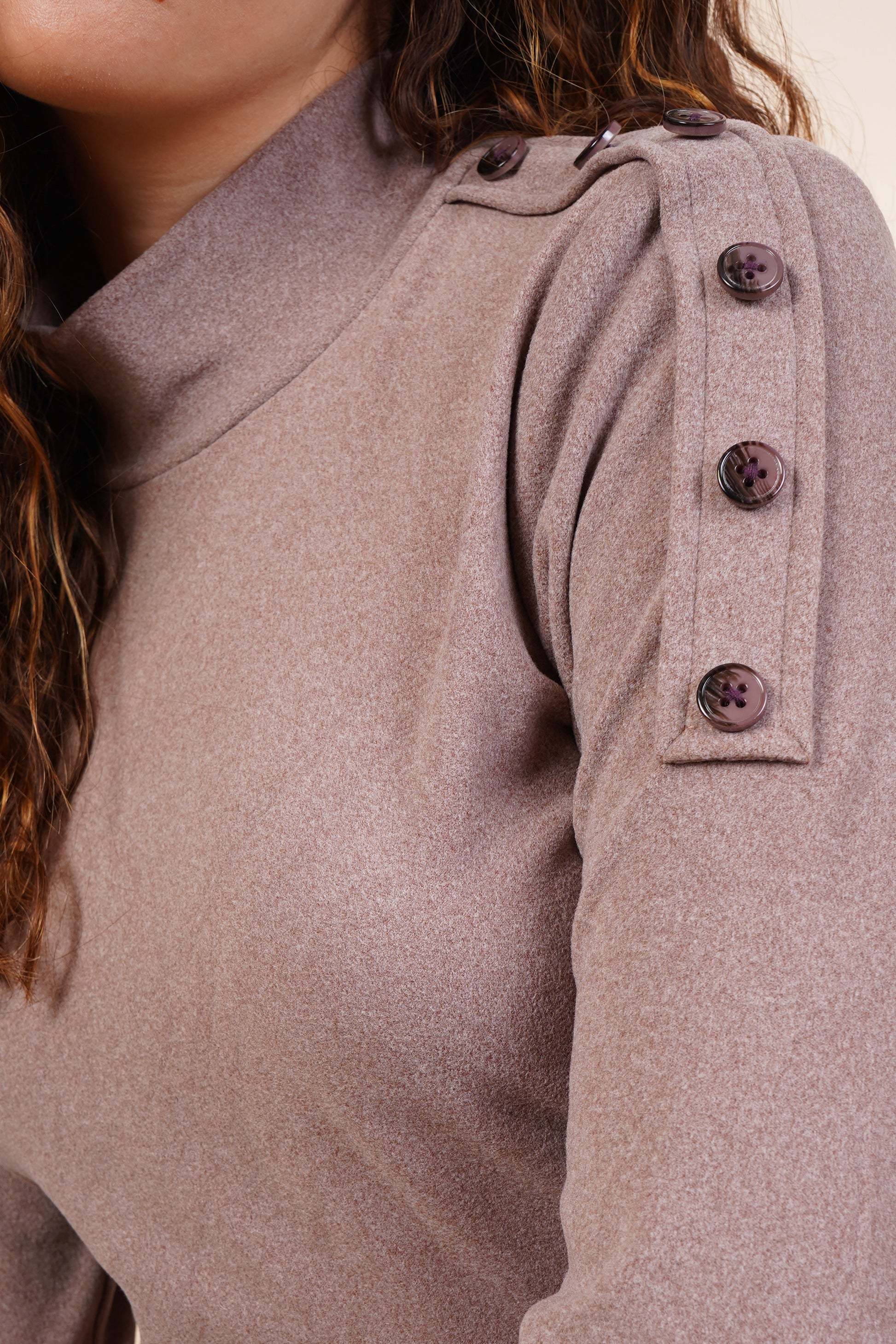 Blusa de manga larga tipo suéter con cuello alto. Corte recto con detalle de botones en los hombros.