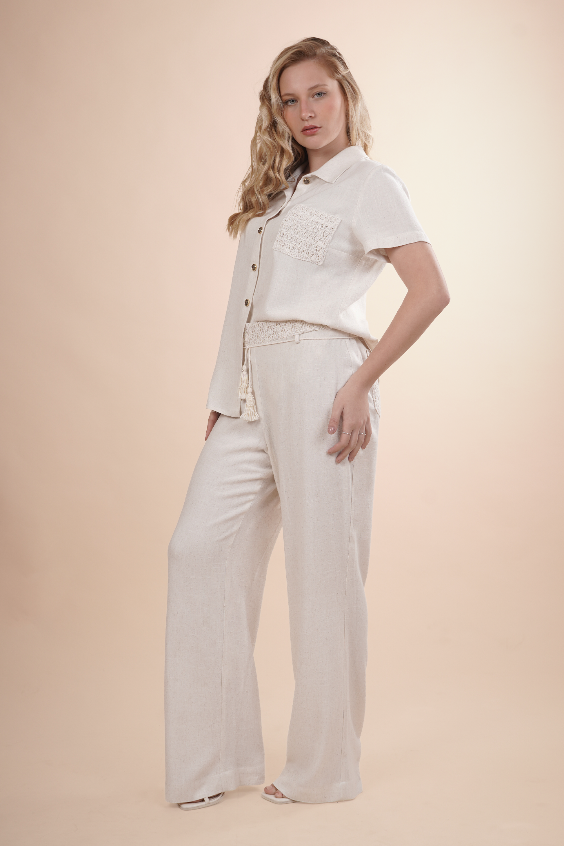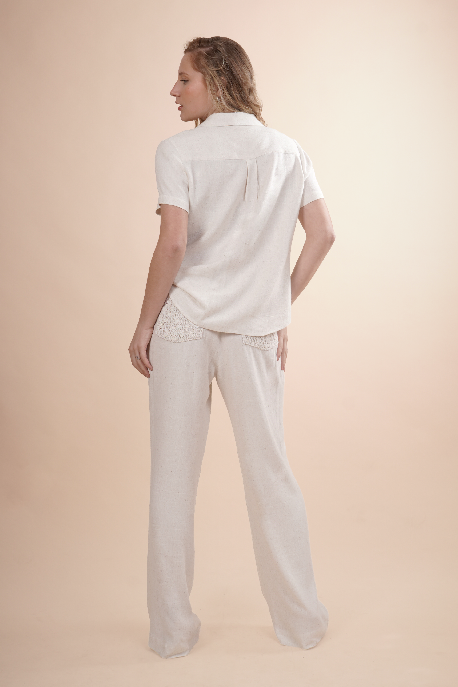Blusa camisera con bolsa de crochet, manga corta. De lino y rayón.