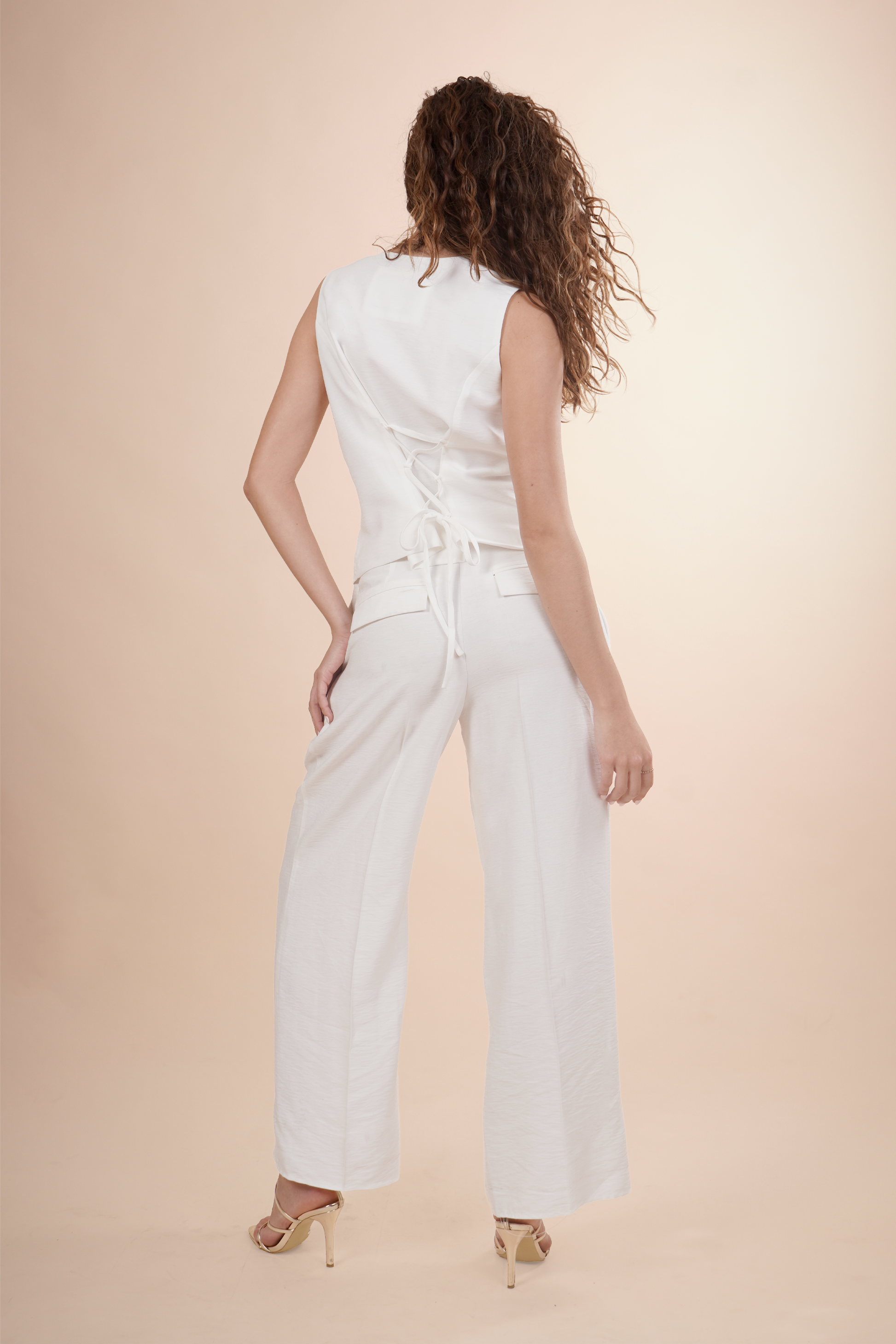 Chaleco blanco con botones dorados y ajustador en espalda.