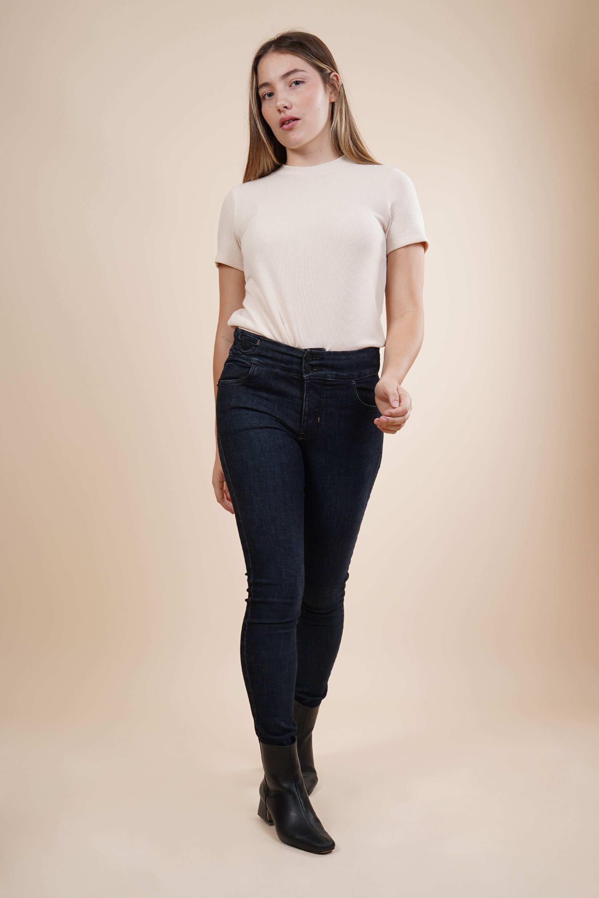 Jeans skinny color marino, con cierre de dos botones.