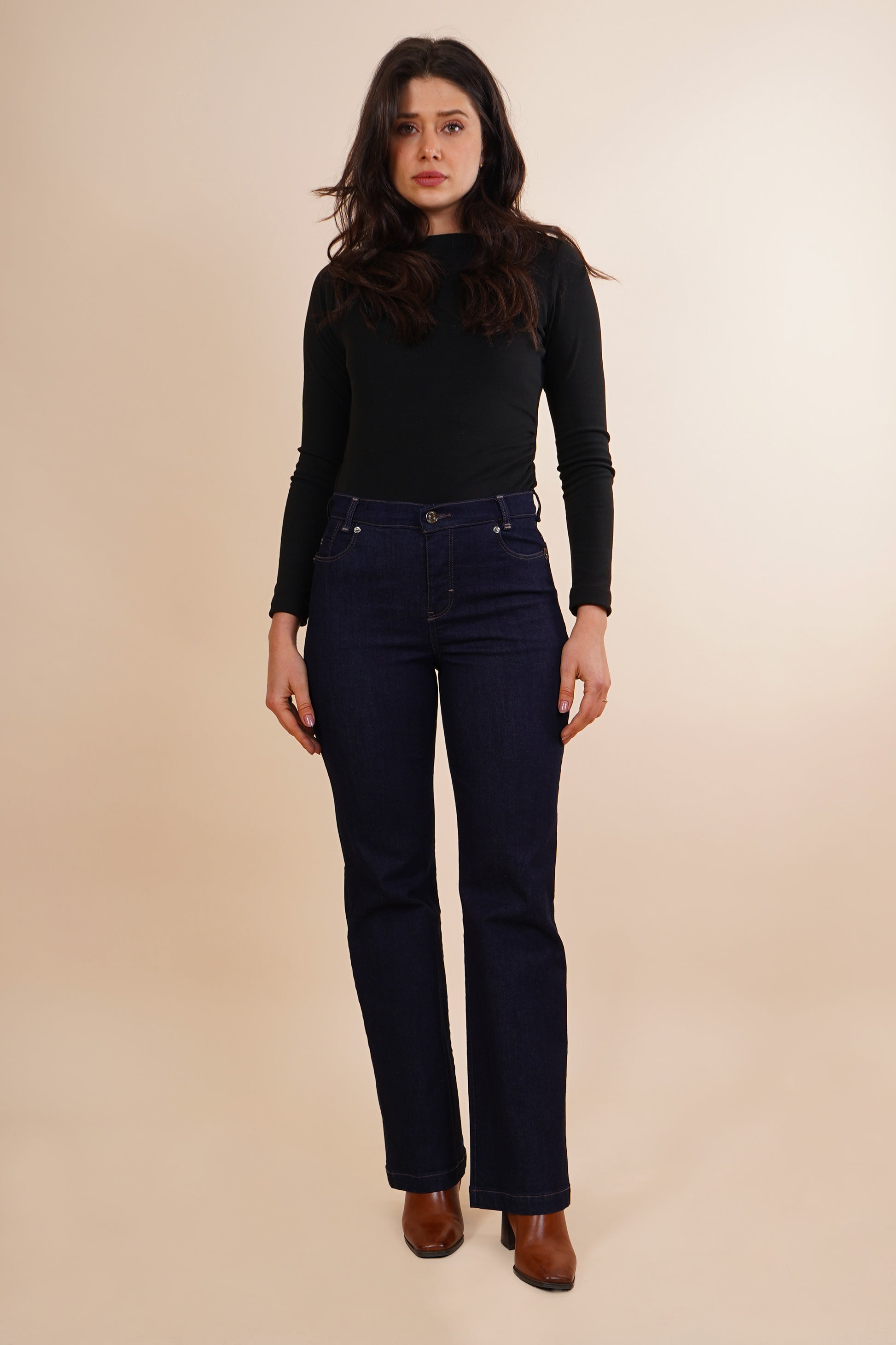 Jeans slim mezclilla oscura, tiro alto.