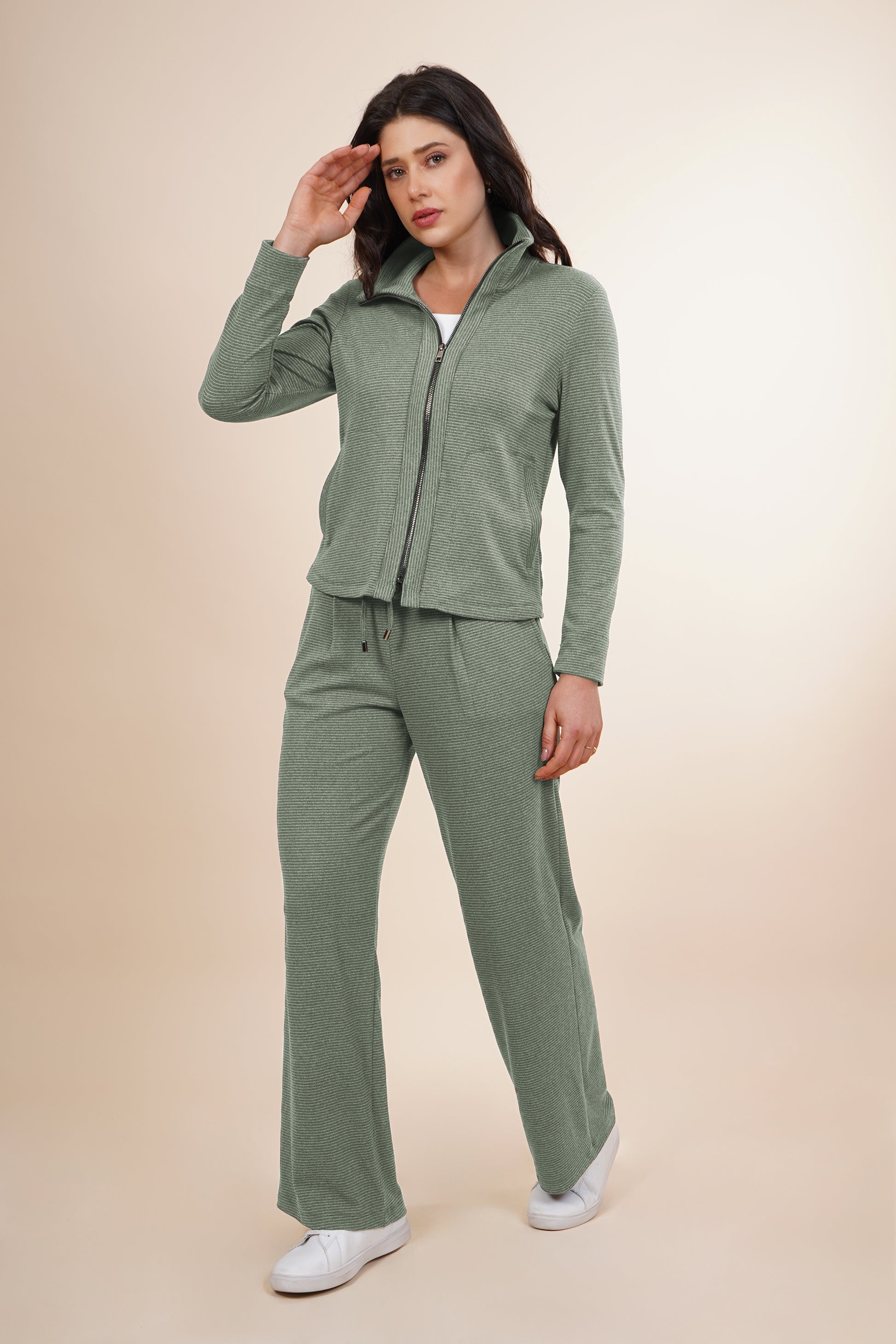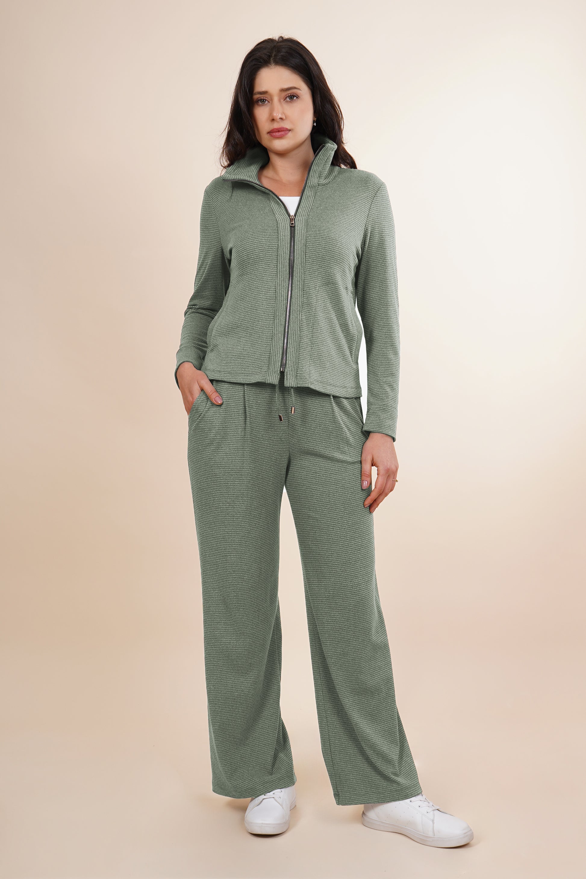 Chamarra verde con cierre en medio, cuello alto y bolsos en los costados.